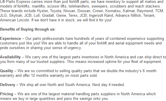 All our lift truck parts are obtainable at the best prices. Phone now to get a quote on one of the parts or attachments we offer. We can be reached at: